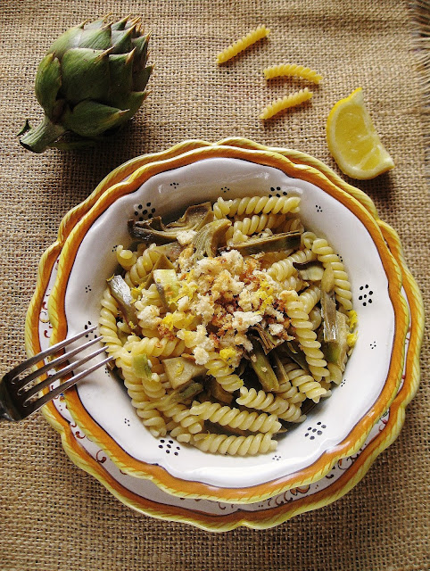 Cuocere la pasta al dente, scolarla e trasferirla nel tegame dei carciofi. Amalgamare con cura, grattare la buccia di limone direttamente sulla pasta e distribuire nei singoli piatti.