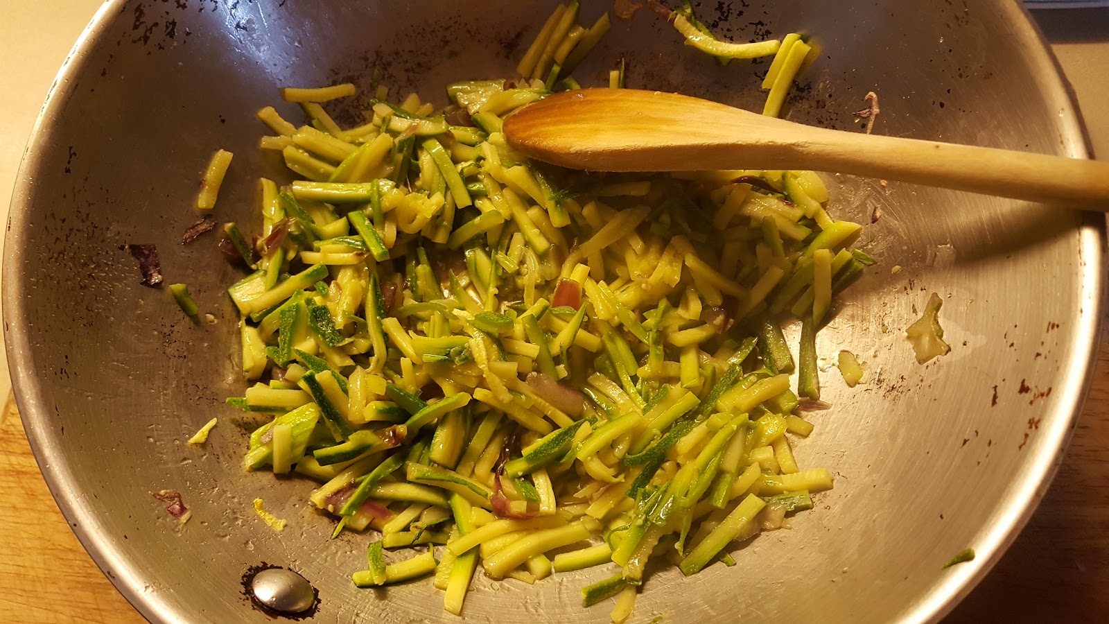 Per prima cosa lavare e spuntare le zucchine e tagliarle a julienne.