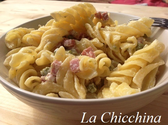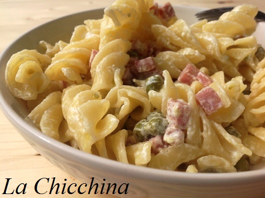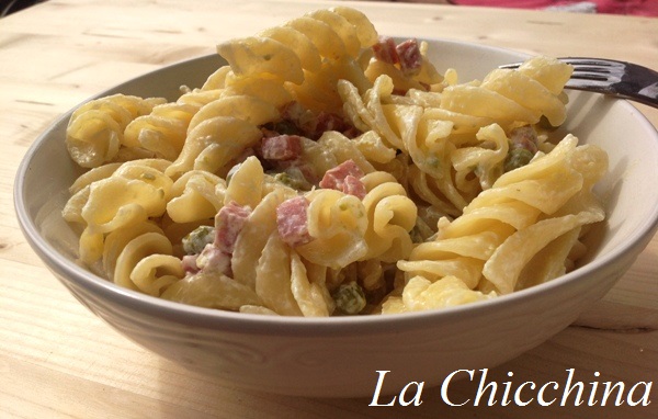 Ecco una pasta semplice, ricca e cremosa: con piselli, panna, e prosciutto; molto semplice da preparare e golosissima, è anche bella da vedere: con i suoi colori delicati ha, secondo me, un che di primaverile.