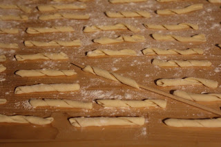 Una volta trascorso il tempo di riposo, tagliare l’impasto in 4 tocchetti e uno alla volta formare dei cilindri dello spessore di circa mezzo centimetro. Tagliare ogni cilindro in alla lunghezza di circa 8 cm.