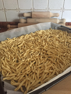 Una volta trascorso il tempo di riposo, tagliare l’impasto in 4 tocchetti e uno alla volta formare dei cilindri dello spessore di circa mezzo centimetro. Tagliare ogni cilindro in alla lunghezza di circa 8 cm.