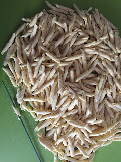 Con uno stecco da spiedino o un ferro da calza ben pulito, iniziando da una delle estremità del cilindro, arrotolare premendo leggermente fino a avvolgere l’impasto intorno allo stecco. Sfilare a questo punto il fusillo e