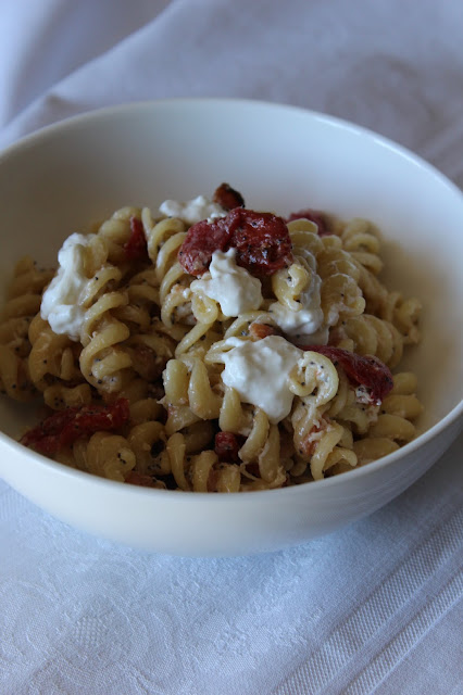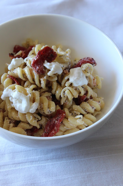 Fusilli freddi con salmone,pomodoro confit e burrata.