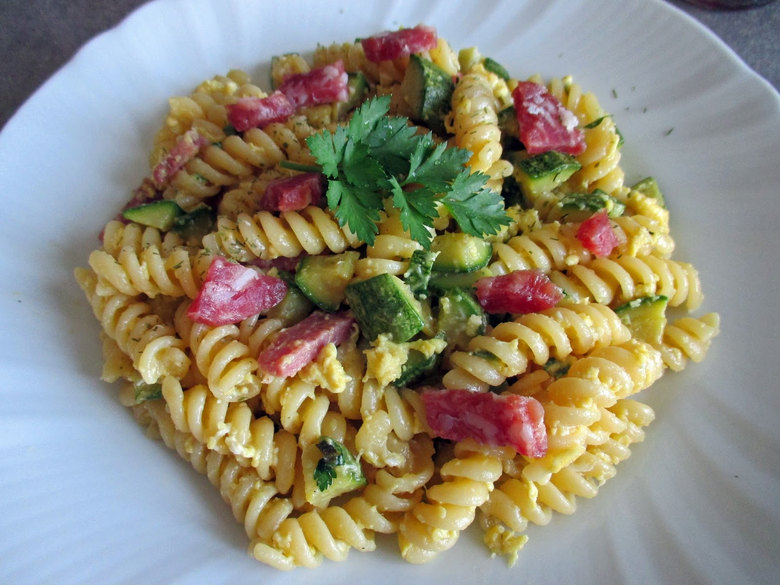 Take a fried with oil and shallots. Add the zucchini and fry. Add half a glass of water, the hand chopped parsley and cook covered for about 10 minutes. Then add also the salami and cook for another 5 minutes. Then turn off the heat and let stand.