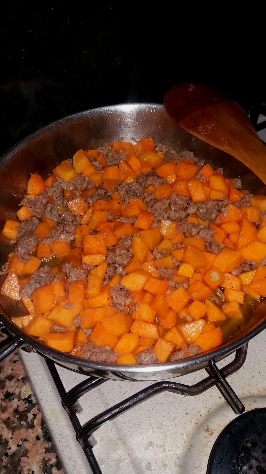 In una capace padella,rosolare salsiccia e cipolla,aggiungere la zucca , salare , pepare e