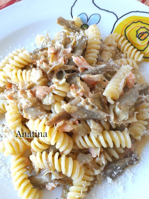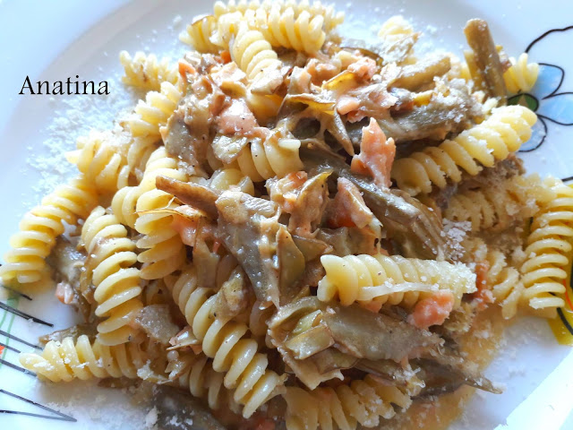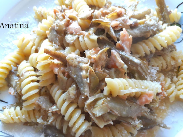 5 carciofi puliti , tagliati a fette sottili e appena scottati in acqua e poco sale