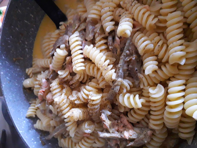 appena rosolato il tutto unire la panna,il pepe ed un mestolo di acqua di cottura della pasta.
