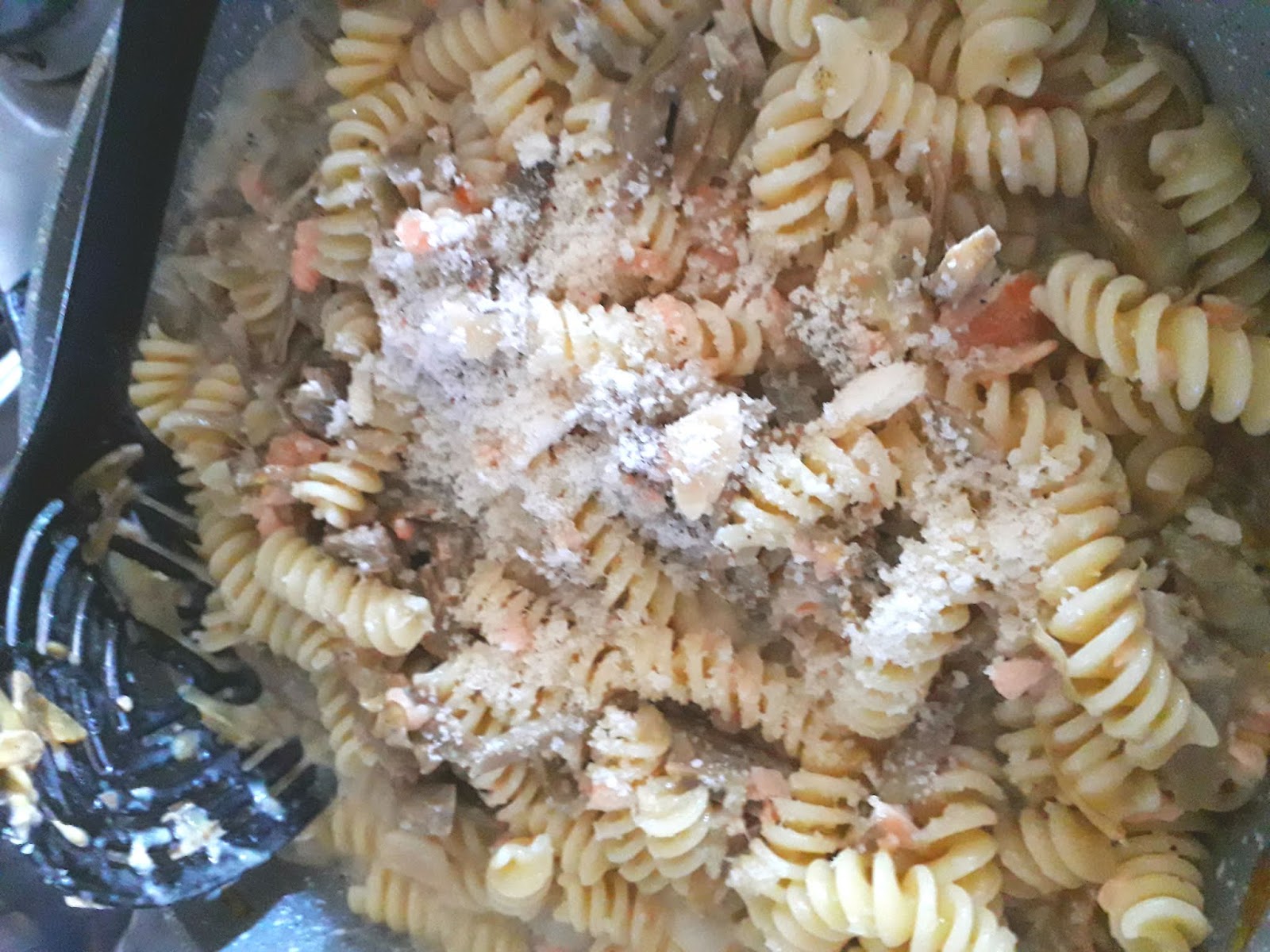 una volta cotti,fare uno spazio centrale nella casseruola e versare il salmone tagliuzzato,
