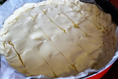 Chiudere la Galette con il secondo disco di pasta sfoglia (premendo bene con le mani lungo la circonferenza) e decorare a piacere: io ho scelto di fare dei tagli formando una scacchiera.
