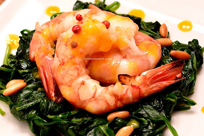 Adagiate quindi i gamberi affumicati sopra gli spinaci, irrorate con la salsa al mandarino…. buon appetito!
