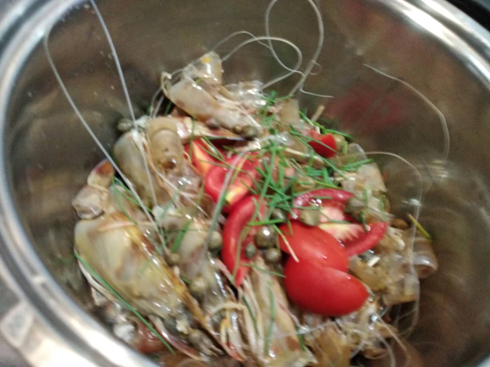 Versione numero 2: dicevo prima che è stato un suggerimento di Antonio. Mi ha spiegato che se voglio esaltare i colori dei crostacei, devo immergerli velocemente in acqua bollente. Così ho fatto e in effetti, come potete vedere, hanno assunto questo meraviglioso colore.