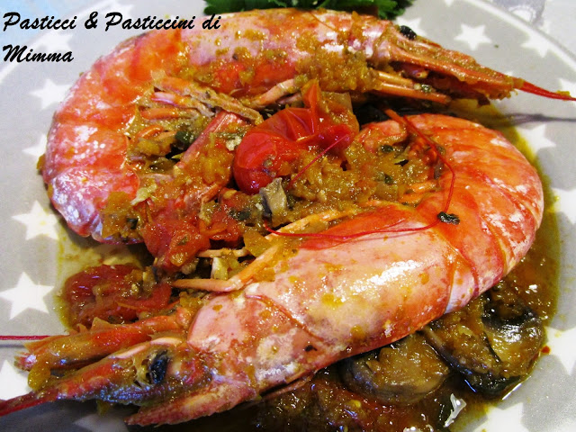 - aggiungere i gamberoni lavati e ben scolati, un pò di sale e cuocere, con il coperchio, a fuoco basso, per 5 minuti