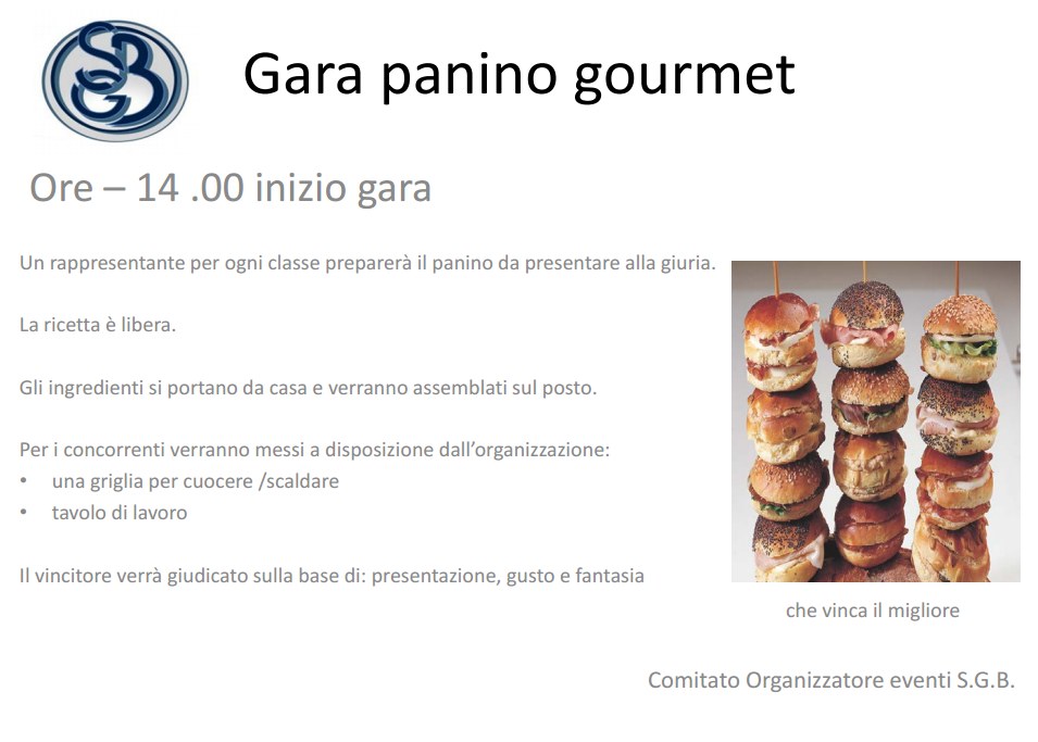 Il giorno 16 aprile 2016 si svolgerà la gara di cucina denominata “Panino gourmet” presso la scuola San Giovanni Battista a Roma, in Via del Casale S.Pio V, io sono stata insignita dell’onore e onere di partecipare come giudice alla gara, al termine della quale sarà redatto un articolo che verrà pubblicato nel blog sulla giornata, le realizzazioni ed i vincitori…
