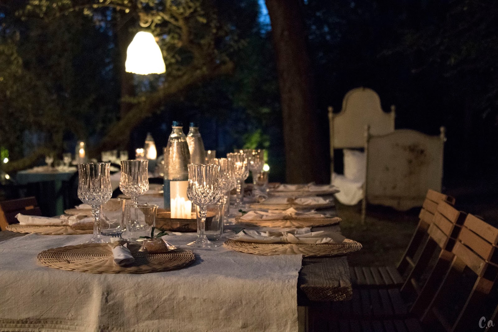 Splendide tavole apparecchiate e la bellissima voce di Chiara hanno poi accolto gli ospiti nella parte di giardino dove si è svolta la cena. Difficile è descrivere la bellezza di della natura tutta attorno a noi, della luce soffusa dei lampadari di cristallo appesi agli alberi e delle candele. Tutto estremamente magico.