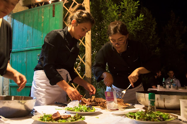 Abbiamo iniziato la serata con un aperitivo nel roseto, tra i grandi alberi e le profumate rose il buffet ha allietato l’arrivo degli ospiti. Pane tostato da accompagnare al famoso paté di olive di Giorgia e alla caponata siciliana che abbiamo preparato con le verdure del mio orto. Orzo perlato con pesto di basilico, noci e semi di lino, una bontà infinita. Una coloratissima insalata greca. In ultimo crema di zucchini (sempre del mio orto) con una quenelle di ricotta e noce moscata.