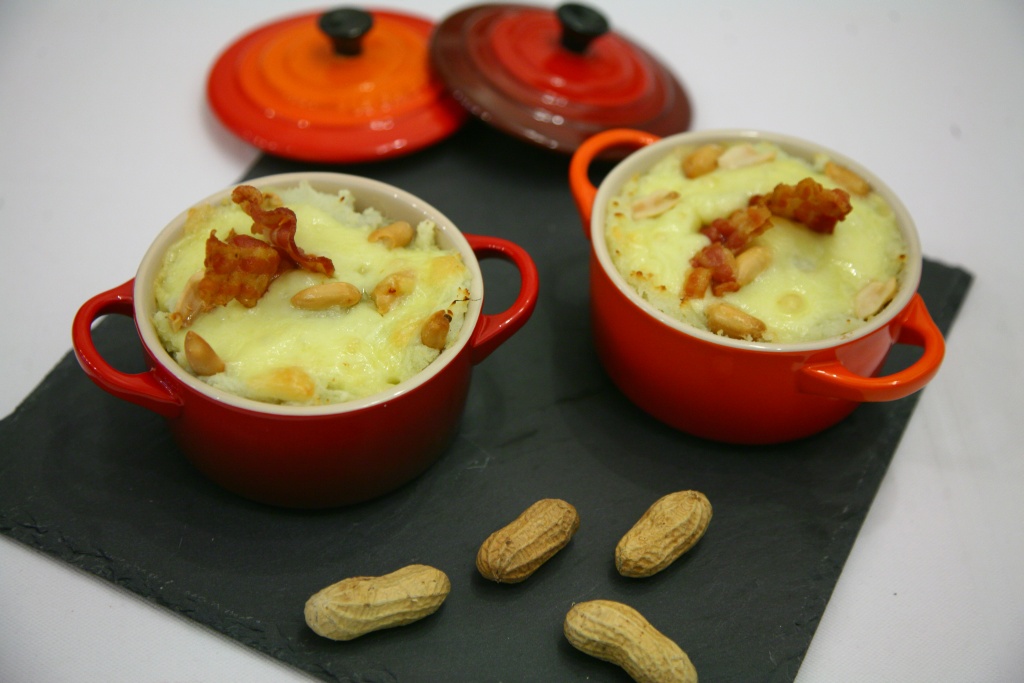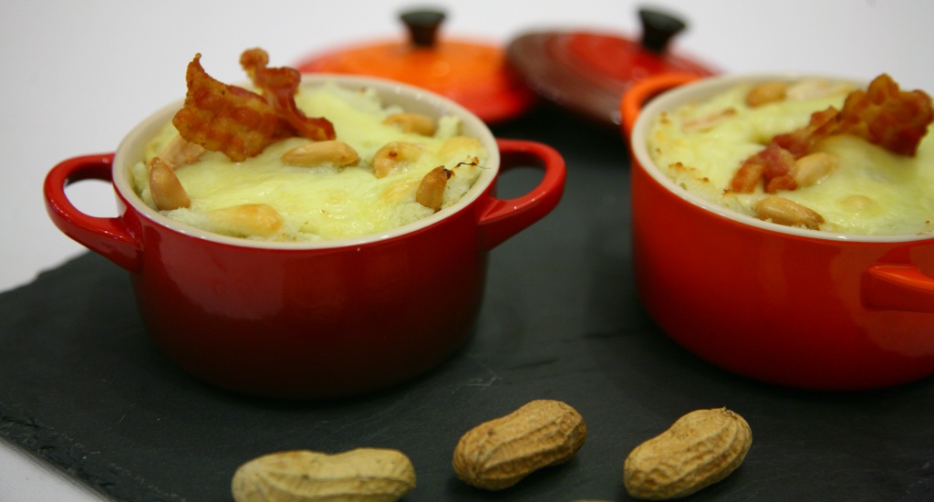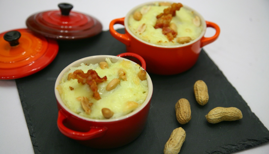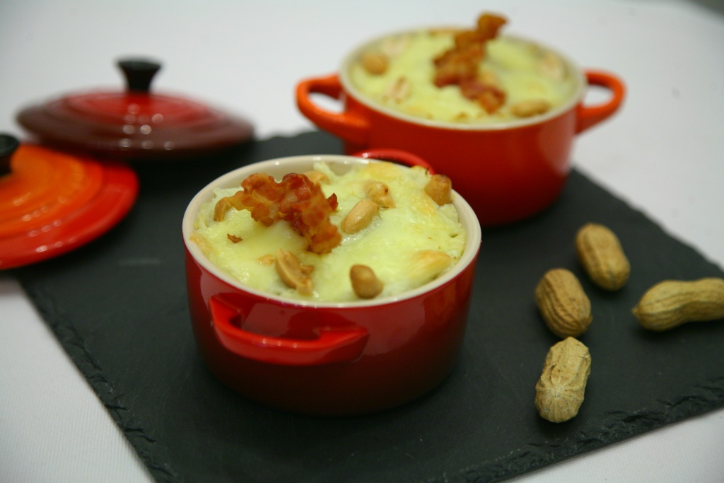 Infornare a 180 gradi (forno ventilato già caldo) e cuocere per una ventina di minuti. Aggiungere come decorazione pezzetti di bacon croccante e le arachidi. Gratinare per 5 minuti.