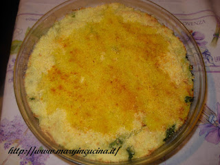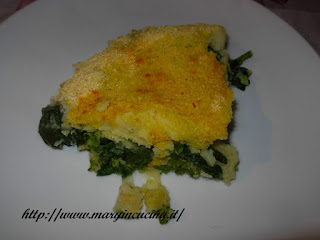 Mescolare 3 cucchiai di farina di ceci con un po’ acqua (circa 1/2 bicchiere) fino ad ottenere una pastella omogenea, aggiungere un pizzico di sale ed unire tutto alle patate. In una tortiera versare un filo d’olio, distribuirvi metà impasto di patate. Distribuirvi le cime di rapa e coprire con l’altra parte delle patate. Livellare bene e spolverizzare con farina di mais, un pizzico di curcuma ed un filo d’olio. Cuocere a 180° per 25 minuti.