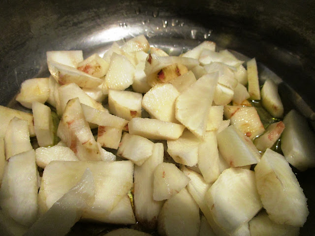 - mondare e affettare i topinambur e cuocerli per 5 minuti in un soffritto di olio, aglio e peperoncino