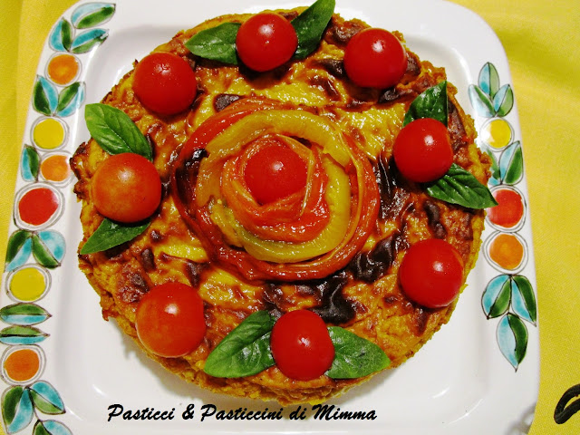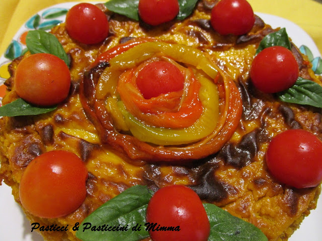 Quando ho sformato il gateau su un piatto da portata, l’ho decorato con qualche filetto di peperoni, tenuto da parte e pomodorini con alcune foglie di basilico.