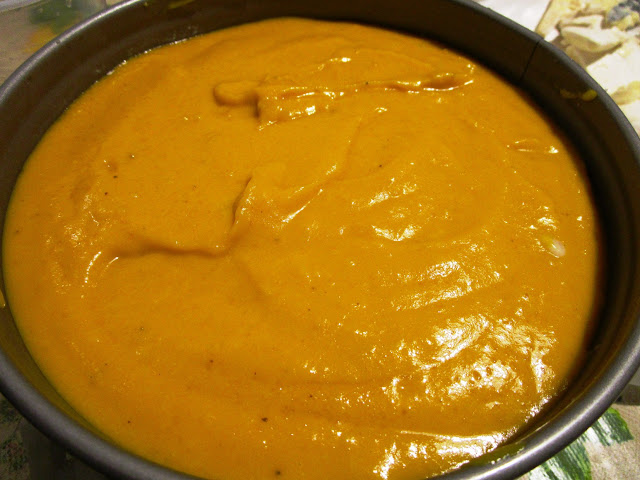 Quindi, in uno stampo rotondo a cerniera, foderato di carta forno il fondo, ho steso uno strato di purea di topinambur con patate,uno strato di peperoni grigliati e spellati e uno strato di purea di zucca con patate e ho infornato.