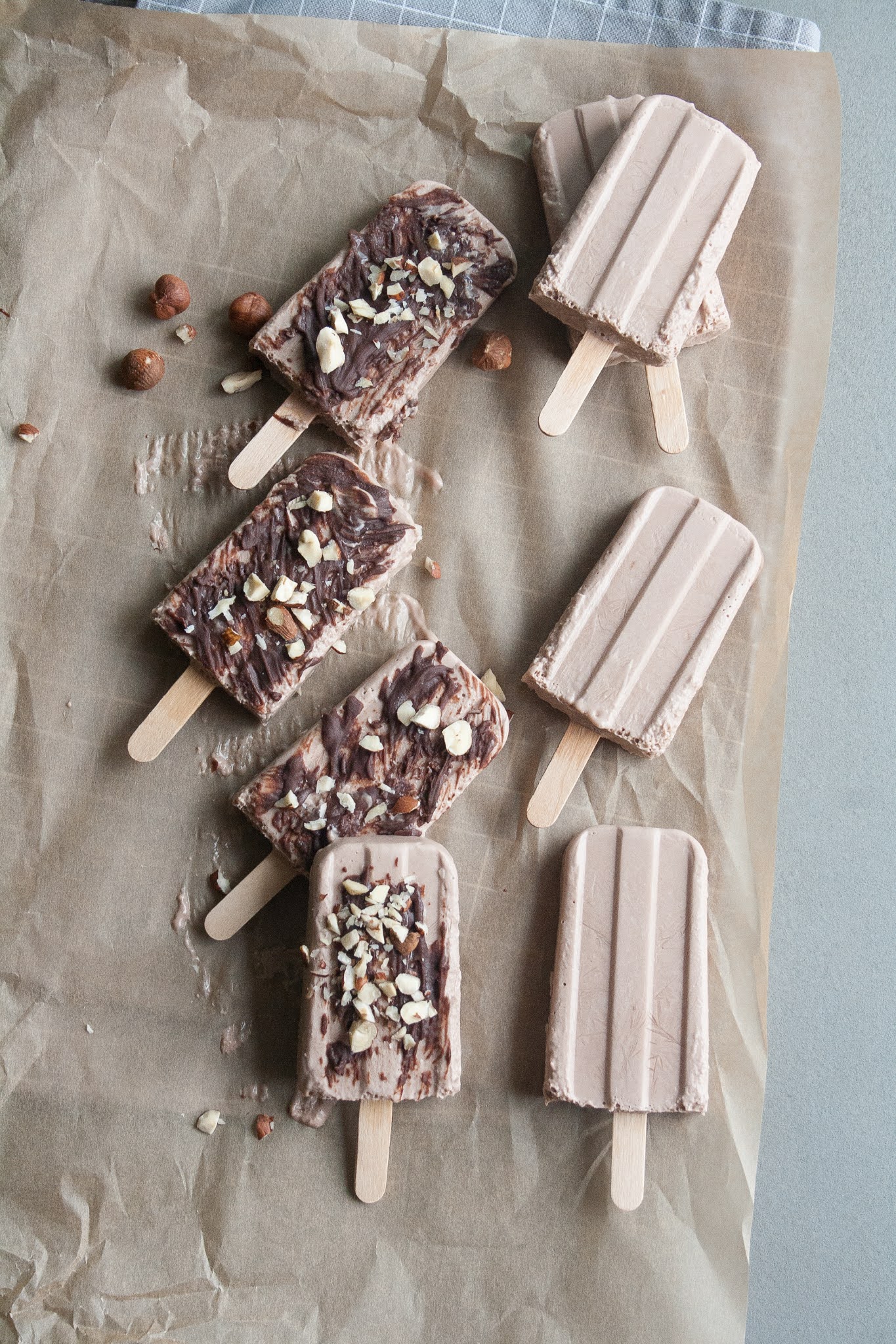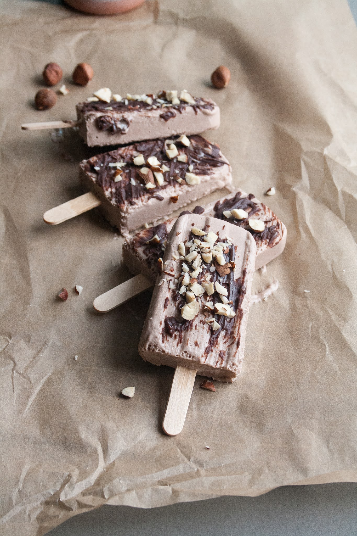 Nel frattempo togliete i gelati dal congelatore (passate lo stampo per qualche secondo sotto l’acqua corrente calda, in modo che i gelati si stacchino facilmente dallo stampo), rimuoveteli dagli stampi, appoggiateli su un piano sopra la carta forno e decorate la superficie con il cioccolato fuso che si rassoderà subito e qualche nocciola tritata. A questo punto rimettete i gelati su stecco in freezer avvolti dalla carta forno fino al momento di servirli.