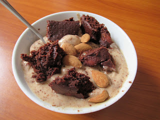 Togliere dal freezer le rondelle 10 minuti circa prima di preparare il gelato, se fa tanto caldo anche meno. Frullare 1 banana fresca a testa, aggiungere le rondelle un po’ alla volta fino ad ottenere una crema morbida. Aggiungere un brownie e frullare ancora. Decorare con le mandorle ed un’altra fetta di brownie spezzettata.