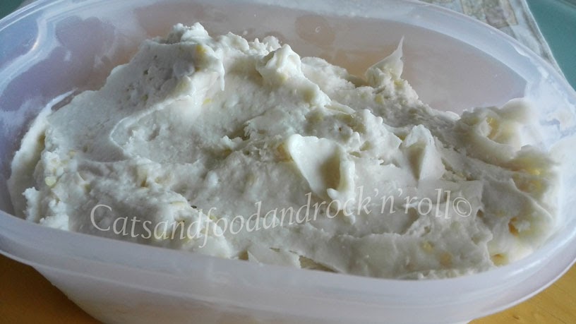 A quel punto, mi si è accesa una lampadina! Guardo in frigo, e vedo che avevo ancora due vasetti di yogurt al cocco e mandorle. Avevo sia il latte di cocco che quello di mandorla, il cocco rapé, la granella di mandorle… voilà! dovevo solo buttare tutto nella gelatiera :-)