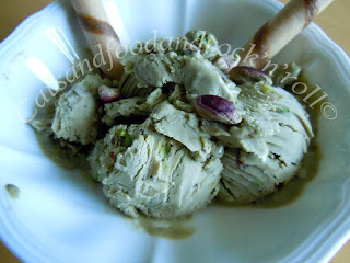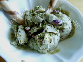 Un consiglio: la granella fatevela da voi, non ci vuole niente. Se volete spellare i pistacchi, sbollentateli prima, togliete la pellicina, fateli saltare un po’ in padella o passateli nel microonde, senza farli tostare, giusto per far asciugare l’umidità assorbita con la sbollentatura, metteteli in un sacchetto di plastica alimentare e passateci sopra il mattarello, triturando finché non siete soddisfatti. La granella che si trova in commercio non sarà certo tossica, ma insomma, sempre di sfridi di produzione si tratta ;-)