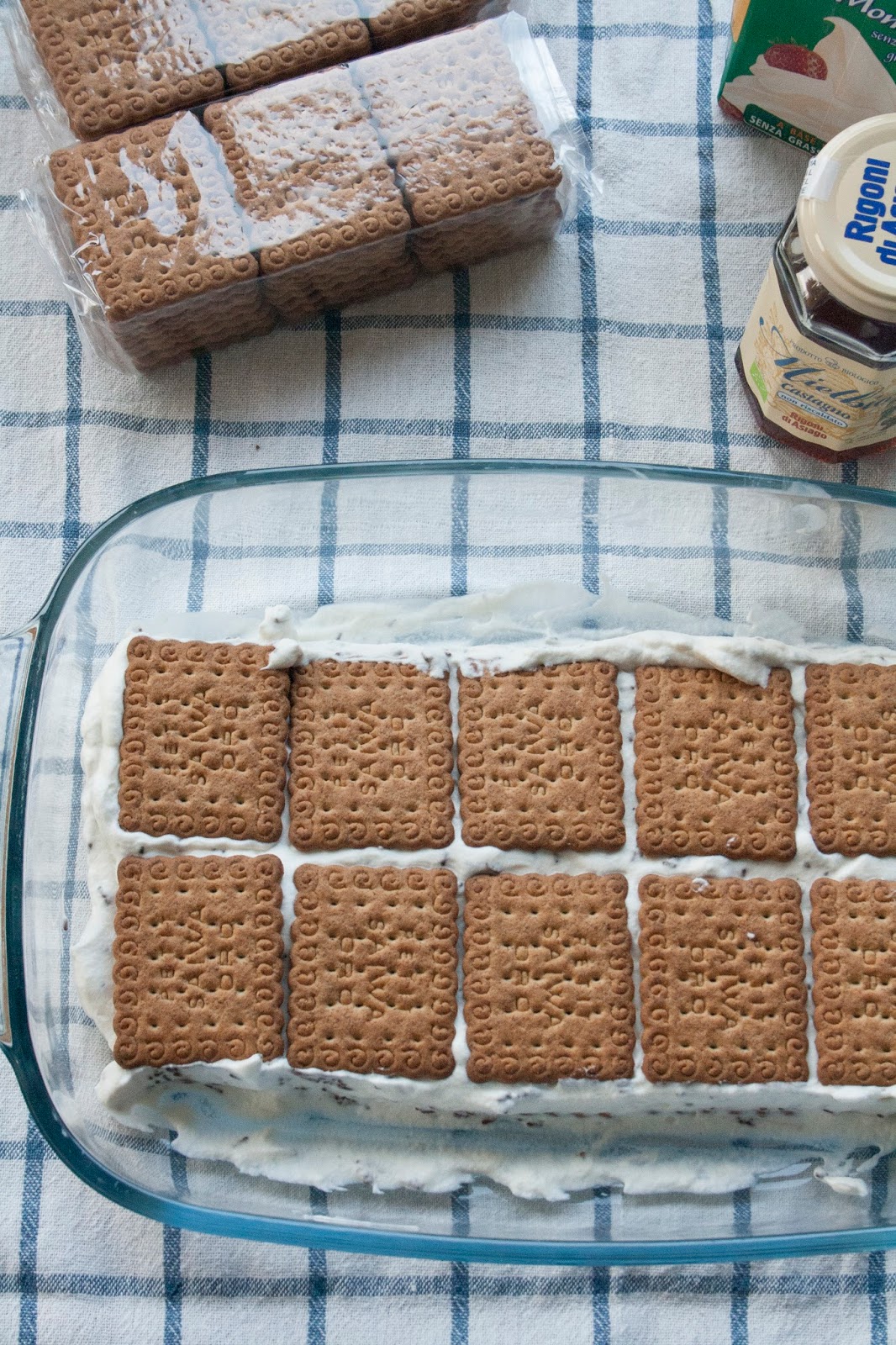 In una pirofila rettangolare coprire il fondo con i biscotti, poi aggiungere la crema montata creando uno strato uniforme alto circa 1 cm e poi coprire interamente con uno strato di biscotti cercando di posizionarli in corrispondenza di quelli iniziali messi sotto la crema.