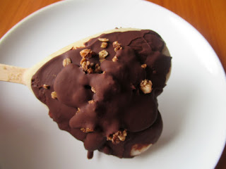 Distribuirvi una manciata di granola. Congelare per almeno 2 ore. Quando sarà ben solido, sciogliere il cioccolato fondente a bagnomaria e rivestire i gelati, dopo averli tolti dalle formine naturalmente. Aggiungere altra granola e riaggiungere altro cioccolato fuso. Adagiare su un vassoio con carta d’alluminio e rimettere in freezer. Tirarli fuori dal frigo 5 minuti prima di degustarli.