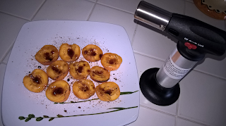 Per la decorazione prendete le albicocche tagliate a metà e caramellatele con dello zucchero di canna: potete farlo in una padella antiaderente oppure, come ho fatto io, con il cannello.