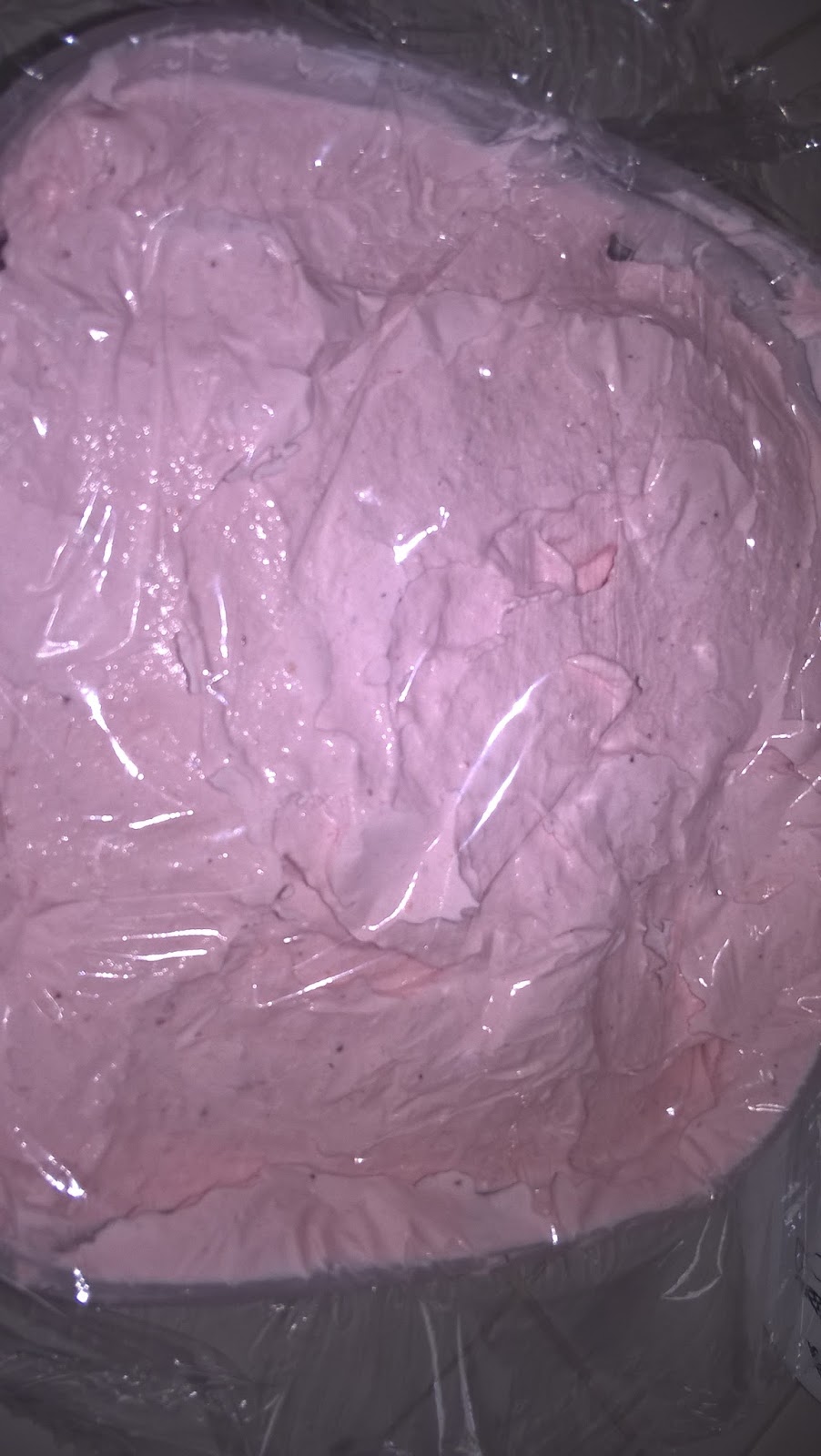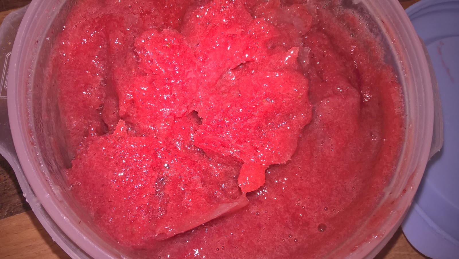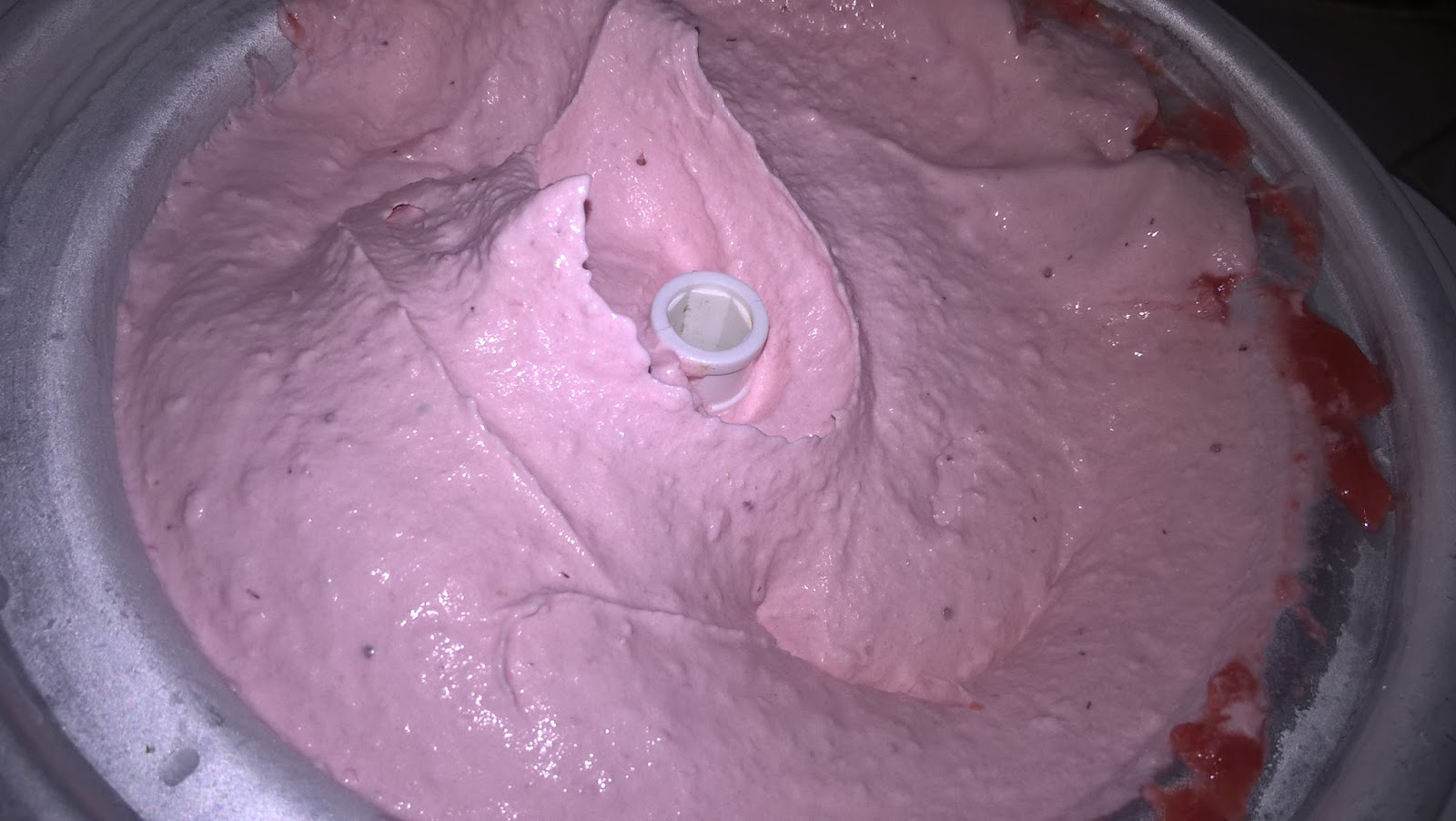 Ingredienti: 250 g di fragole frullate fredde, 100 g di zucchero, 250 g di panna (anche vegetale), 6 g di farina di semi di carrube, sciroppo di rose (se volete prepararlo voi cliccate qui ).
