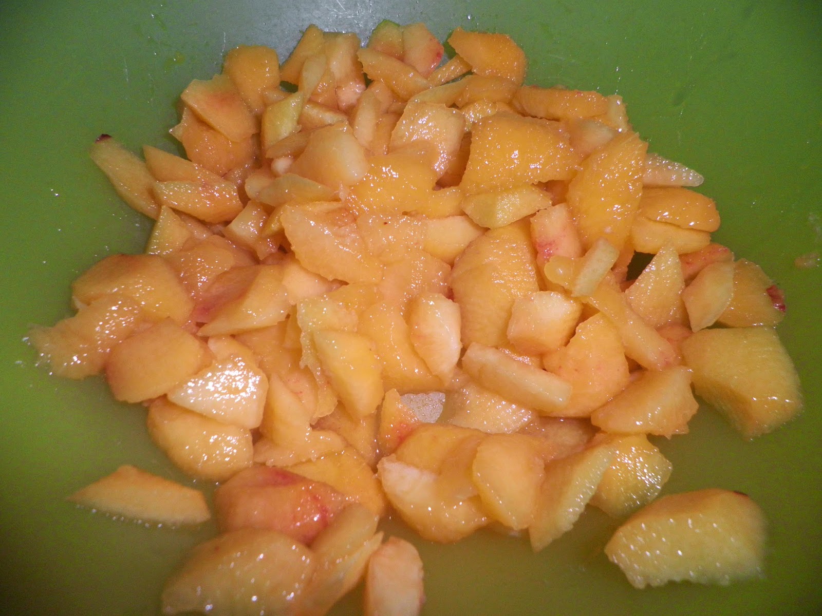 Tagliate a piccoli pezzetti 2 belle pesche. Mettetele in un pentolino con due cucchiai di zucchero e fate sciroppare leggermente (giusto il tempo che si sciolgalo zucchero).