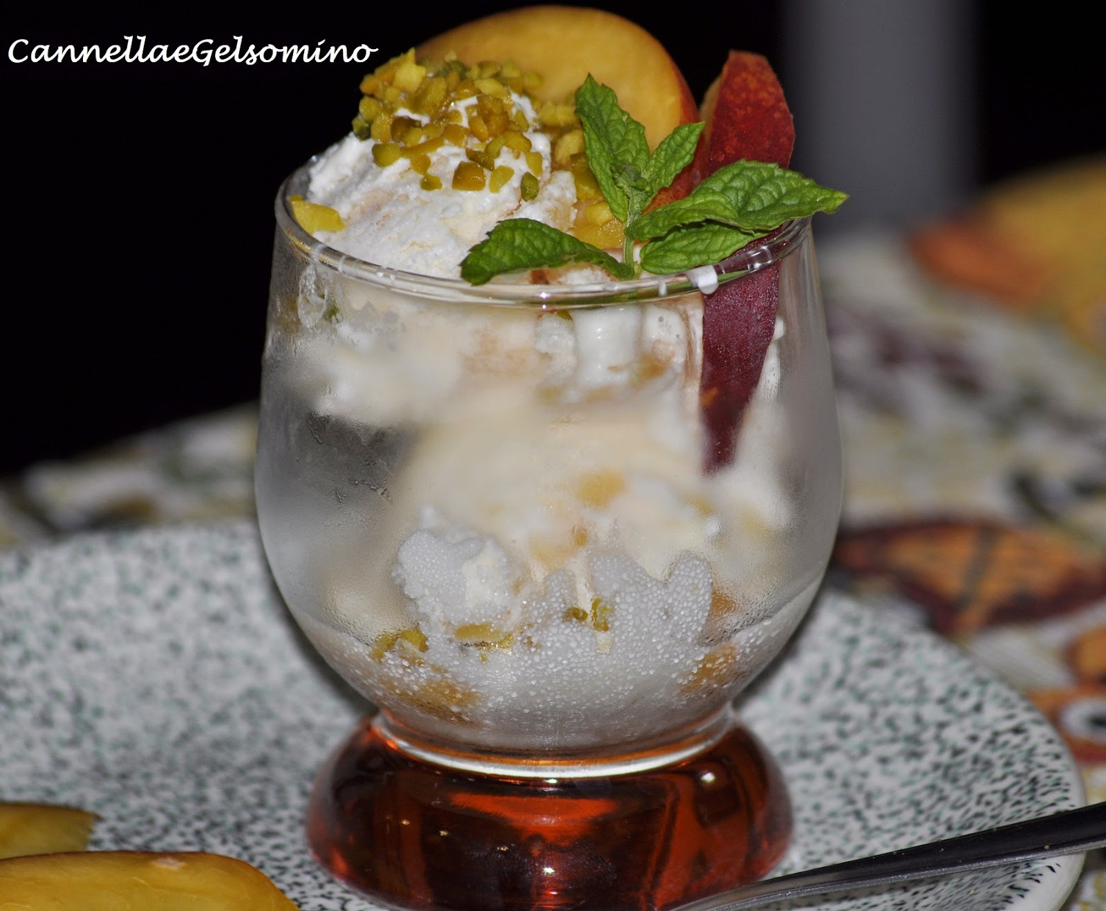 Decorate la vostra coppa di gelato con fettine di pesca, foglioline di menta e granella di pistacchio.