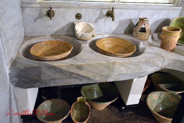 A lato è presente un grande piano di marmo (a ciappa do lavello), tipico della cucina genovese, dove sono inclusi due grandi lavelli, lavandini, che io immagino affollato di povere sguattere, serve, intente ad arrüxentà (risciacquare) i piatti sporchi dei suntuosi banchetti nobiliari, ma almeno con l’acqua calda, proveniente dalla caldaia, e che usciva da questi preziosi bronzin, rubinetti, di ottone.