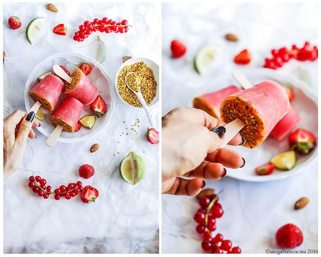 Così oggi vi propongo una sana merenda contro la calura estiva: i ghiaccioli di anguria con polline, ovvero un super integratore – ricco in proteine, aminoacidi ( tutti e 8, quelli essenziali per l’uomo), vitamine e sali minerali - energetico e rivitalizzante.