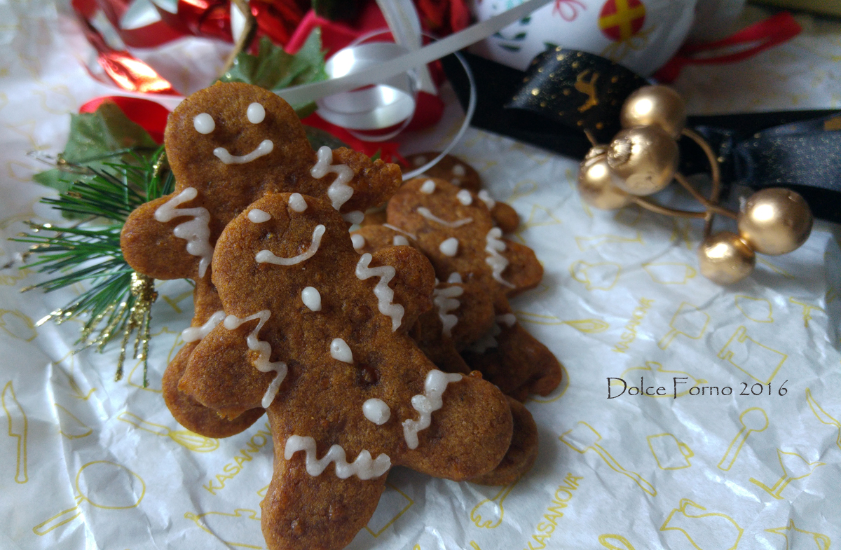 In una capace ciotola amalgama le polveri: prima farina e zucchero sfregandoli tra le mani per sciogliere i “grumi” dello zucchero di canna, poi aggiungi bicarbonato, zenzero e cannella e mescola bene. Fai un buco al centro, versa l’olio e la melassa e lavorali con le mani per creare un composto che stia insieme, se necessario aggiungi un cucchiaio di acqua. Ora copri la ciotola con pellicola e fai riposare in frigo per qualche ora, stenderai più facilmente la pasta. Se hai fretta, puoi preparare anche subito i tuoi biscotti, per agevolarti stendi piccole quantità alla volta lasciando in frigorifero l’impasto. Potrebbe essere necessario stendere tra due fogli di pellicola, devi stendere la pasta sottile, pochi millimetri di spessore. Cuoci in forno caldo a 160°, modalità ventilato per 10 minuti. Appena usciti dal forno i biscotti sono morbidi, induriranno man mano che raffreddano. Prepara la glassa unendo un cucchiaino di acqua alla volta a 50 g di zucchero a velo, è pronta quando cola lentamente dal cucchiaio. Riempi una sacca a poche usa e getta, disegna i tuoi biscotti e lascia asciugare la glassa. Si conservano in scatole di latta.