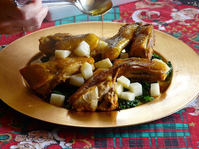 Prendiamo un piatto da portata, versiamo sul fondo gli spinaci novelli e un pò di sedano rapa, quindi adagiamo i pezzi di faraona e un pò del nostro sugo di cottura.