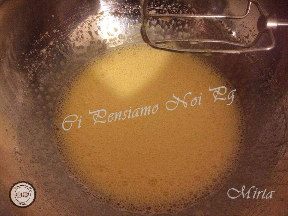 In una terrina rompere 5 uova intere e lo zucchero e montarle con la planetaria o lo sbattitore fino a che non diventano belle spumose e gonfie. (io ci ho messo circa 10-15 minuti)