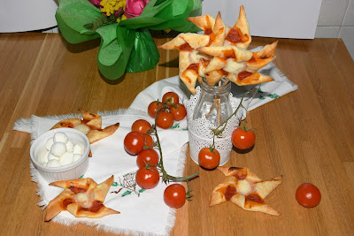 Stendete al centro un cucchiaino di passata di pomodoro e formate la girandola ripiega do verso il centro uno dei vertici dei triangoli formati, alternandoli.