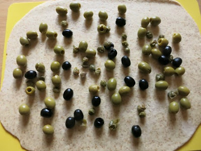 Disporre le olive e i capperi s gocciolati e strizzati e aiutandoci con il tappetino arrotoliamo il rettangolo..
