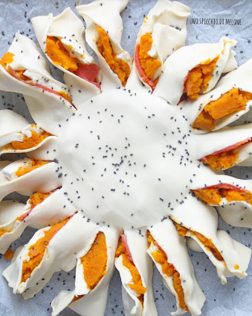 Una volta finito di fare i RICCI :-) potete cospargere il GIRASOLE con tanti SEMI di PAPAVERO (o di SESAMO NERO) ed infornare a 200°C per circa 30 minuti.