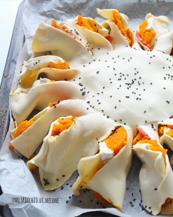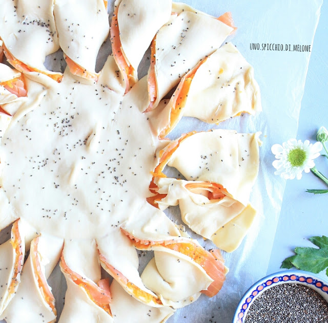Il procedimento per il GIRASOLE è molto facile: prendete il primo disco di pasta sfoglia (con la sua carta da forno), lo stendete nella teglia da forno più grande che avete (così i ricciolini che andrete a fare rimarranno belli distesi) e lo farcite → uno strato di robiola, uno di purea di zucca ed uno di salmone.