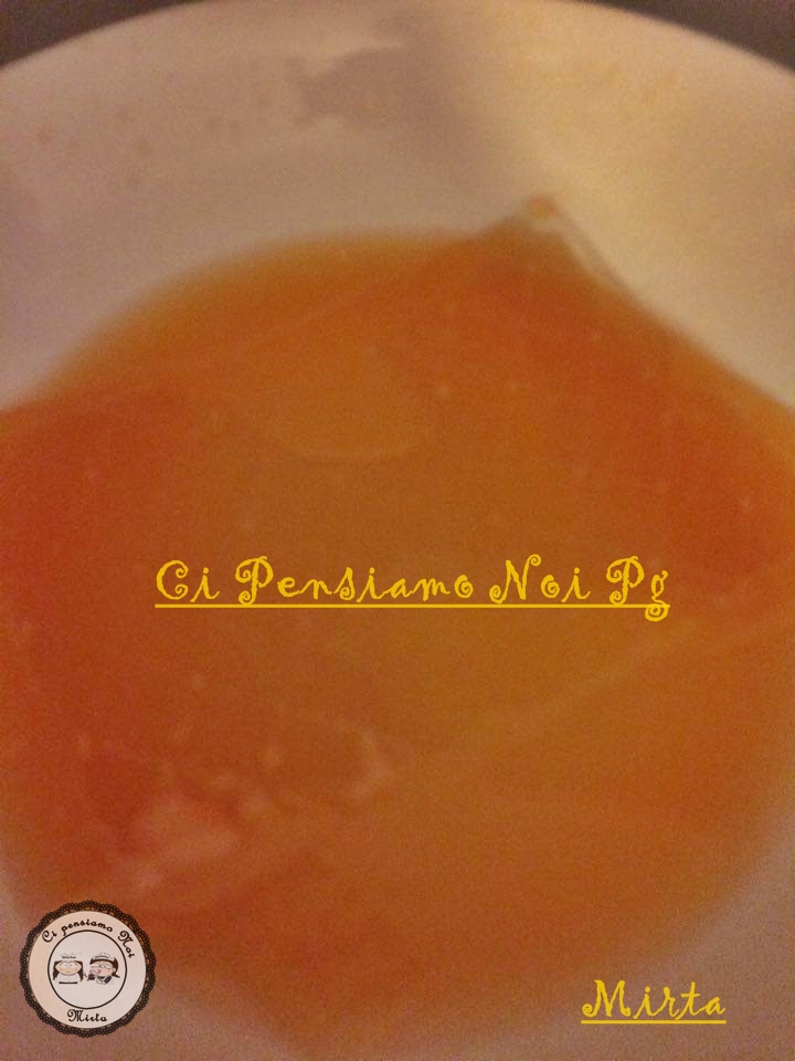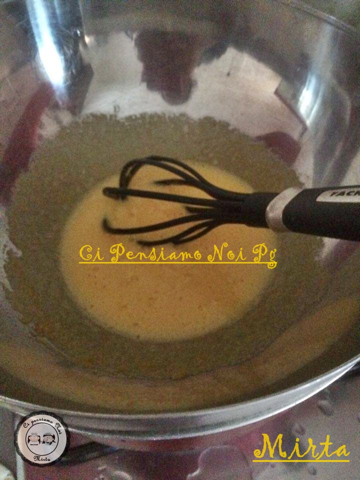 Prendo un’arancia ne tolgo la scorza cercando di non grattare la parte bianca, la taglio ne spremo il succo e ci faccio ammollare la colla di pesce.Intanto in una ciotola rompo i tuorli e verso lo zucchero e lavoro il composto a bagno maria fino a che le uova non raddoppiano di volume. Aggiungo un pochino di succo d’arancia prelevandolo dalla colla di pesce ammollata e verso la zest.