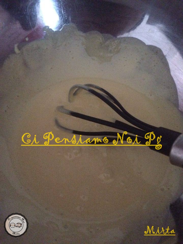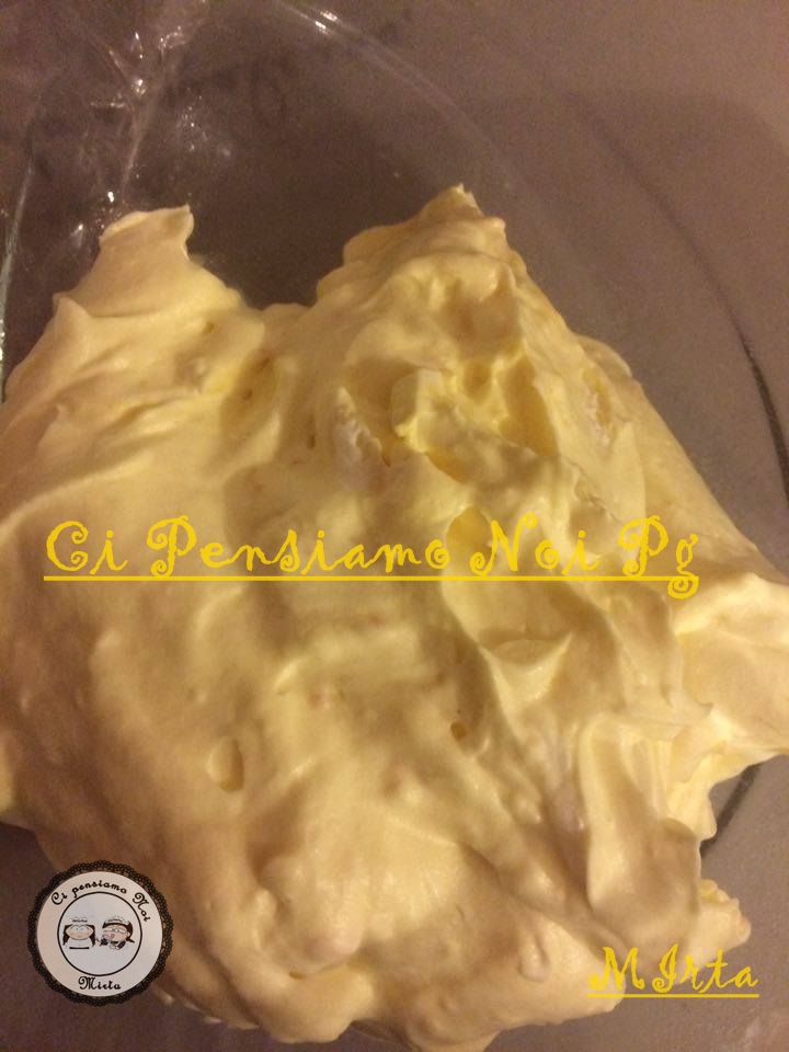 Una volta raddoppiato il volume delle uova aggiungo a caldo la colla di pesce. Tolgo dal tegame e nel frattempo monto 200 ml di panna.Aggiungo la panna montata al composto di uova e metto in frigo per 2 ore.