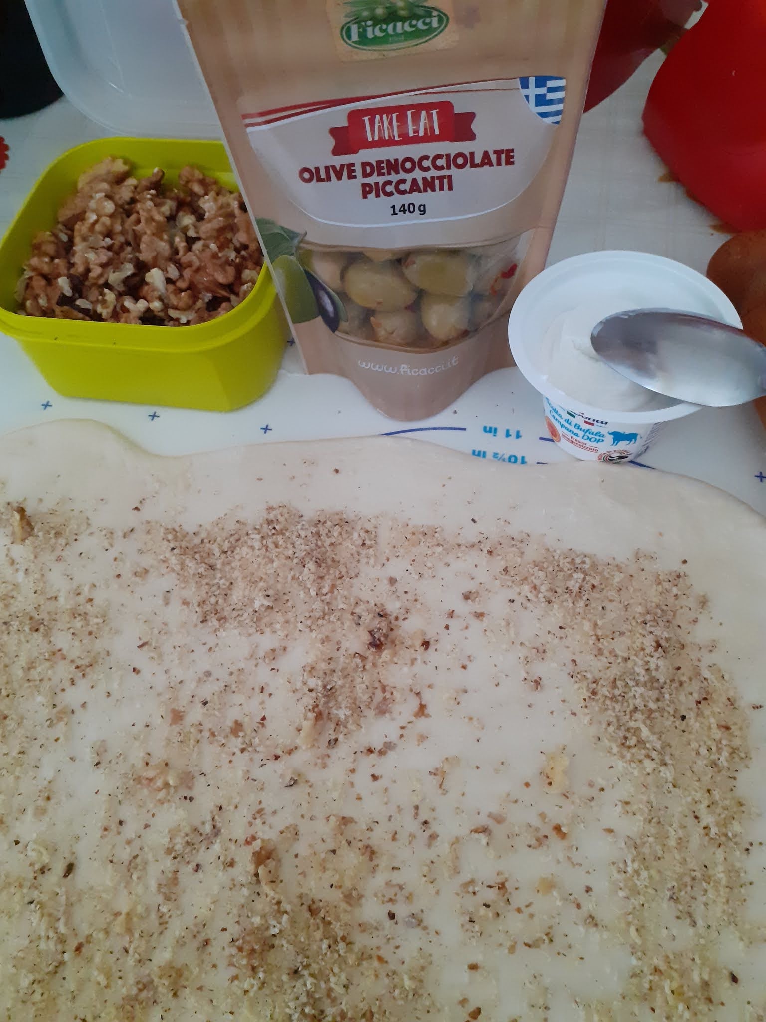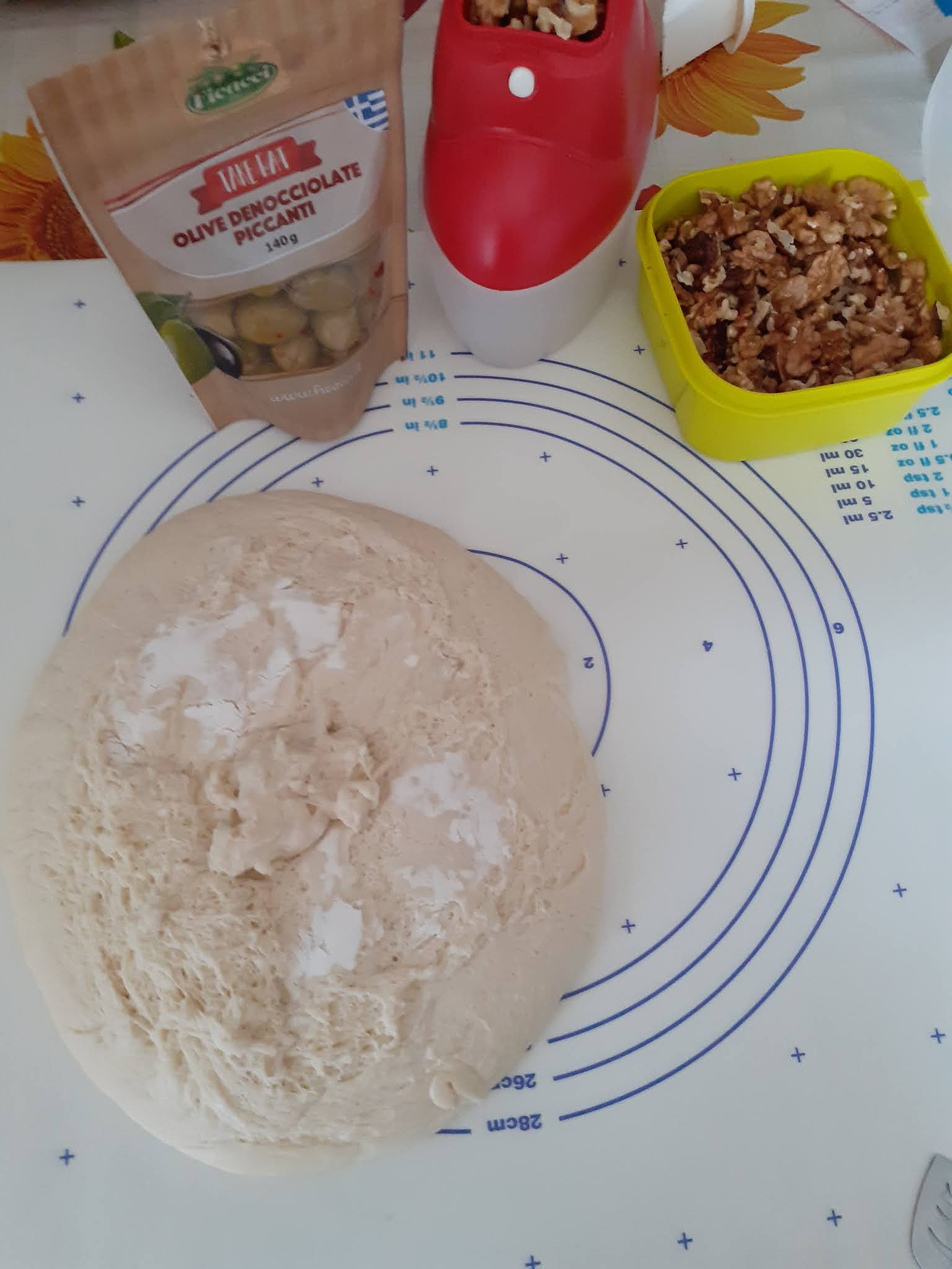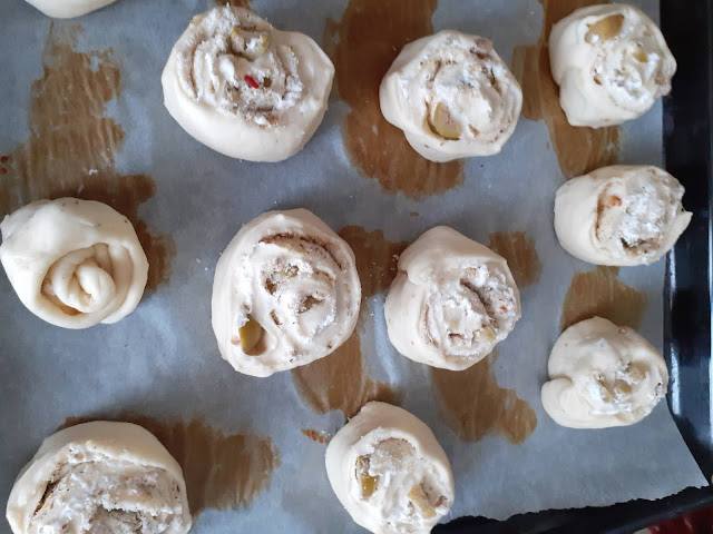 Una volta che l’impasto è lievitato lo stendiamo con un mattarello della dimensione voluta e spalmiamo con formaggio,olive e noci,arrotoliamo il tutto e tagliamo a fette spesse.Appoggiamo su teglia con carta forno,distanziandole ,ricopriamo e rimettiamo a lievitare