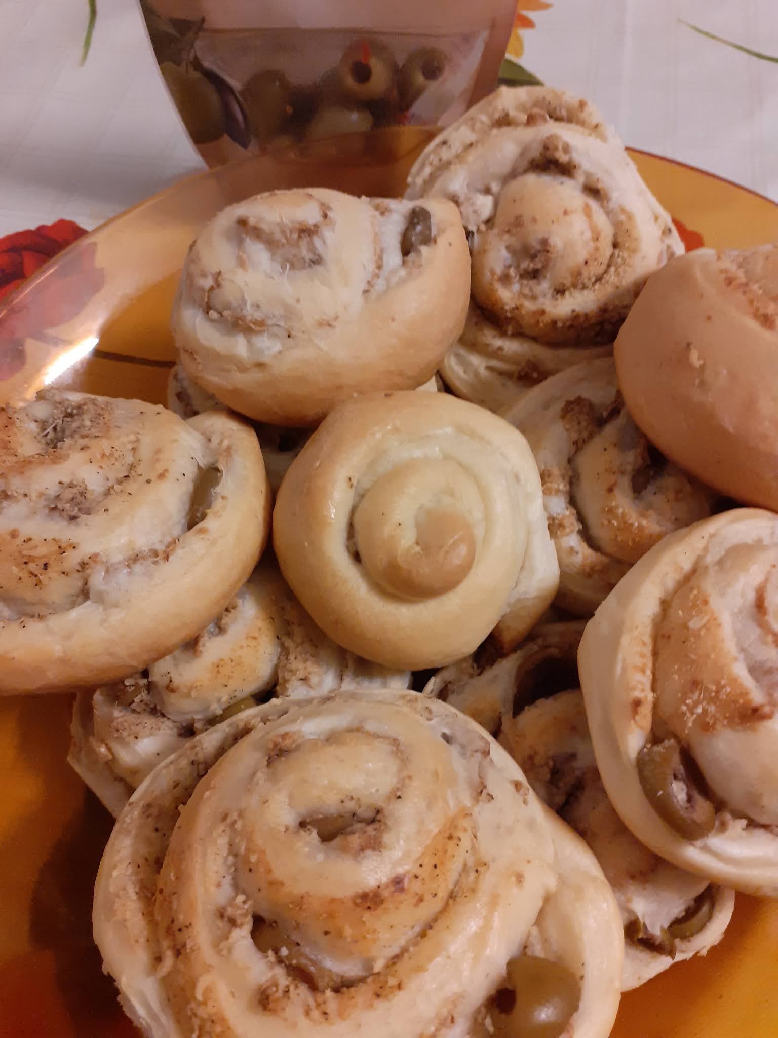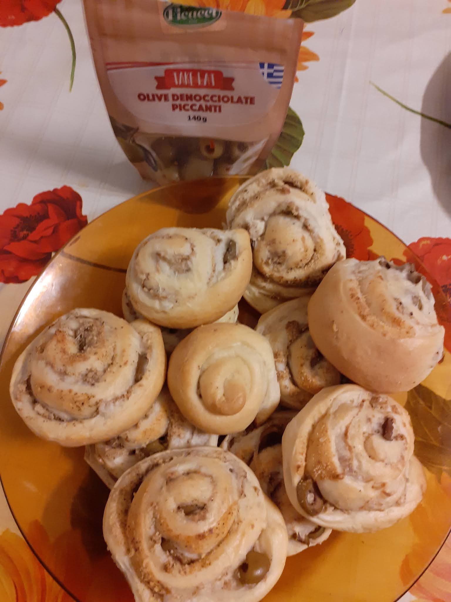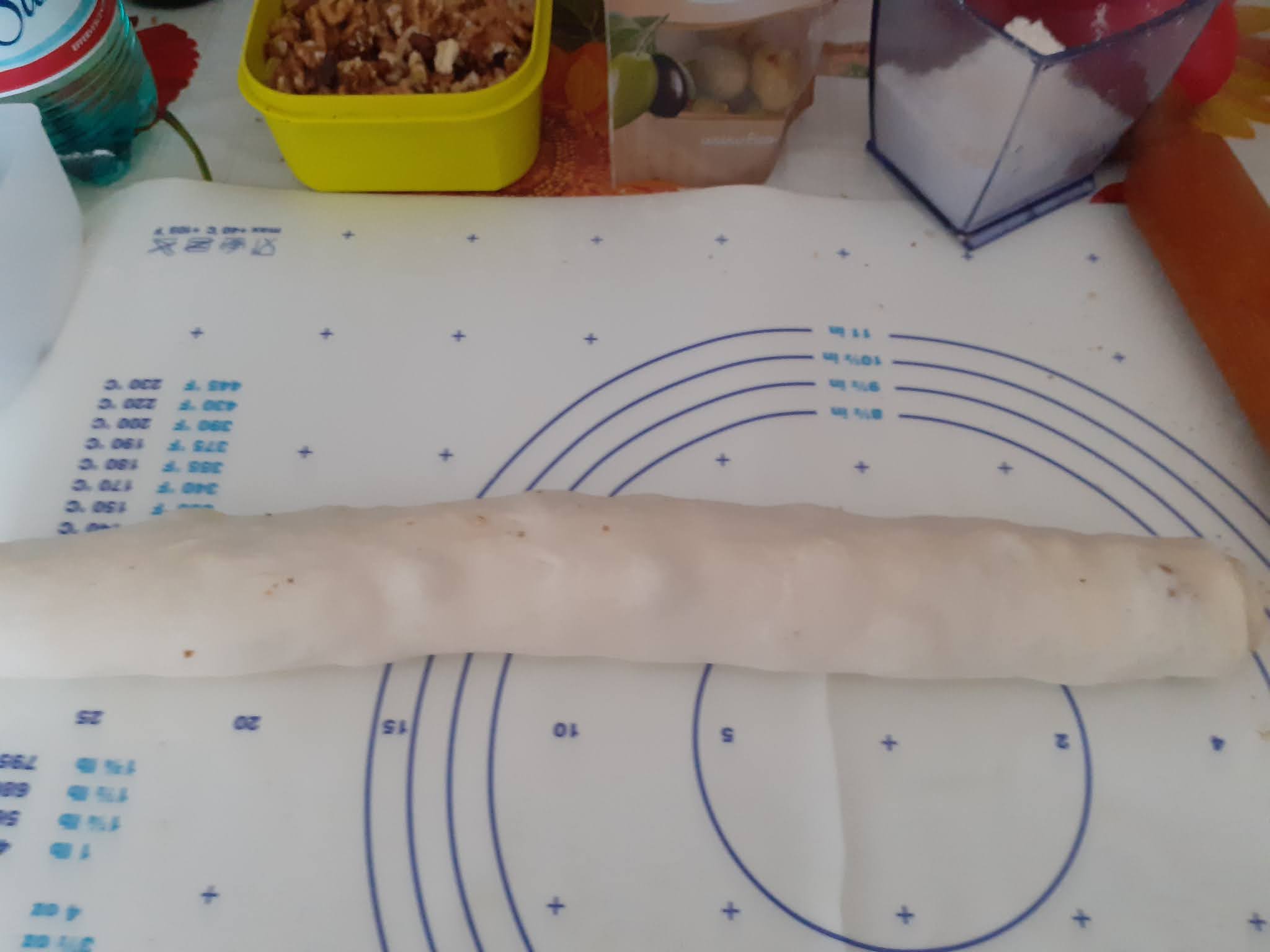 Una volta che l’impasto è lievitato lo stendiamo con un mattarello della dimensione voluta e spalmiamo con formaggio,olive e noci,arrotoliamo il tutto e tagliamo a fette spesse.Appoggiamo su teglia con carta forno,distanziandole ,ricopriamo e rimettiamo a lievitare
