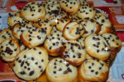 Ricavare con un coltello a lama liscia le girelle di spessore a proprio piacimento, spennellarle con il latte e cospargerle con le gocce di cioccolata fondente.