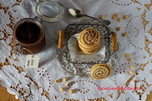 Stendete l’impasto in un rettangolo di 5mm di spessore, spalmateci la vostra Nutella e la granella di nocciole, arrotolate nel senso della lunghezza, tagliate il rotolo a metà, avvolgeteli in pellicola e rimettete in frigo per 1 ora.