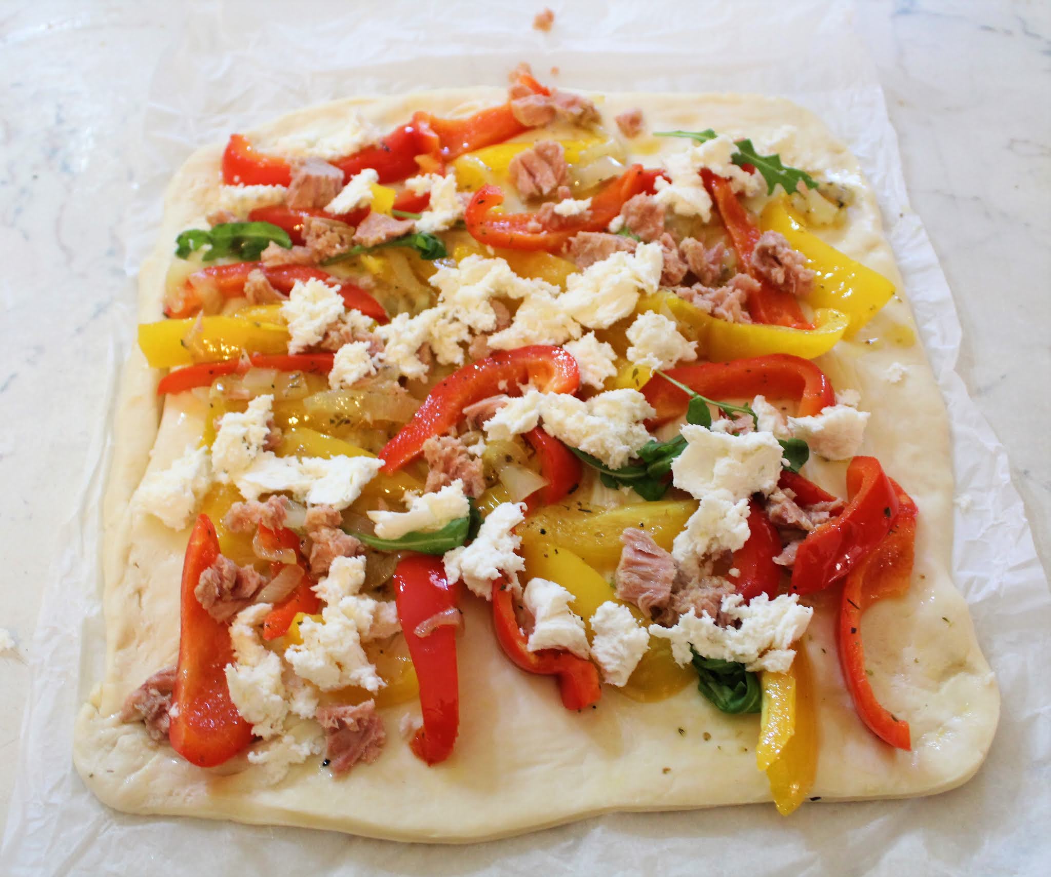Distribuire sulla base i peperoni ormai tiepidi, la mozzarella a fettine e rucola a piacere; salare leggermente e “condire” con un filo d’olio.